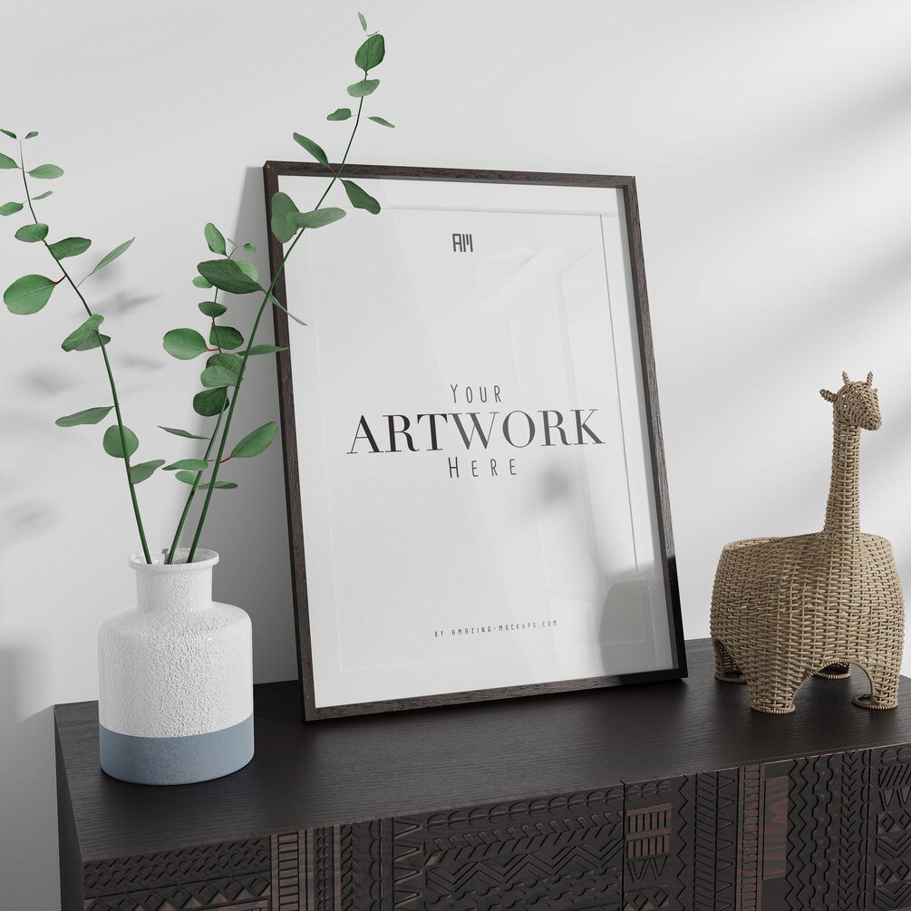 Create a stunning presentation for your posters, art prints, or photography with this professionally crafted Dark Wooden Picture Frame Mockup. Ideal for graphic designers, artists, Etsy or Shopify sellers, and anyone looking to elevate their visuals in a sophisticated way.